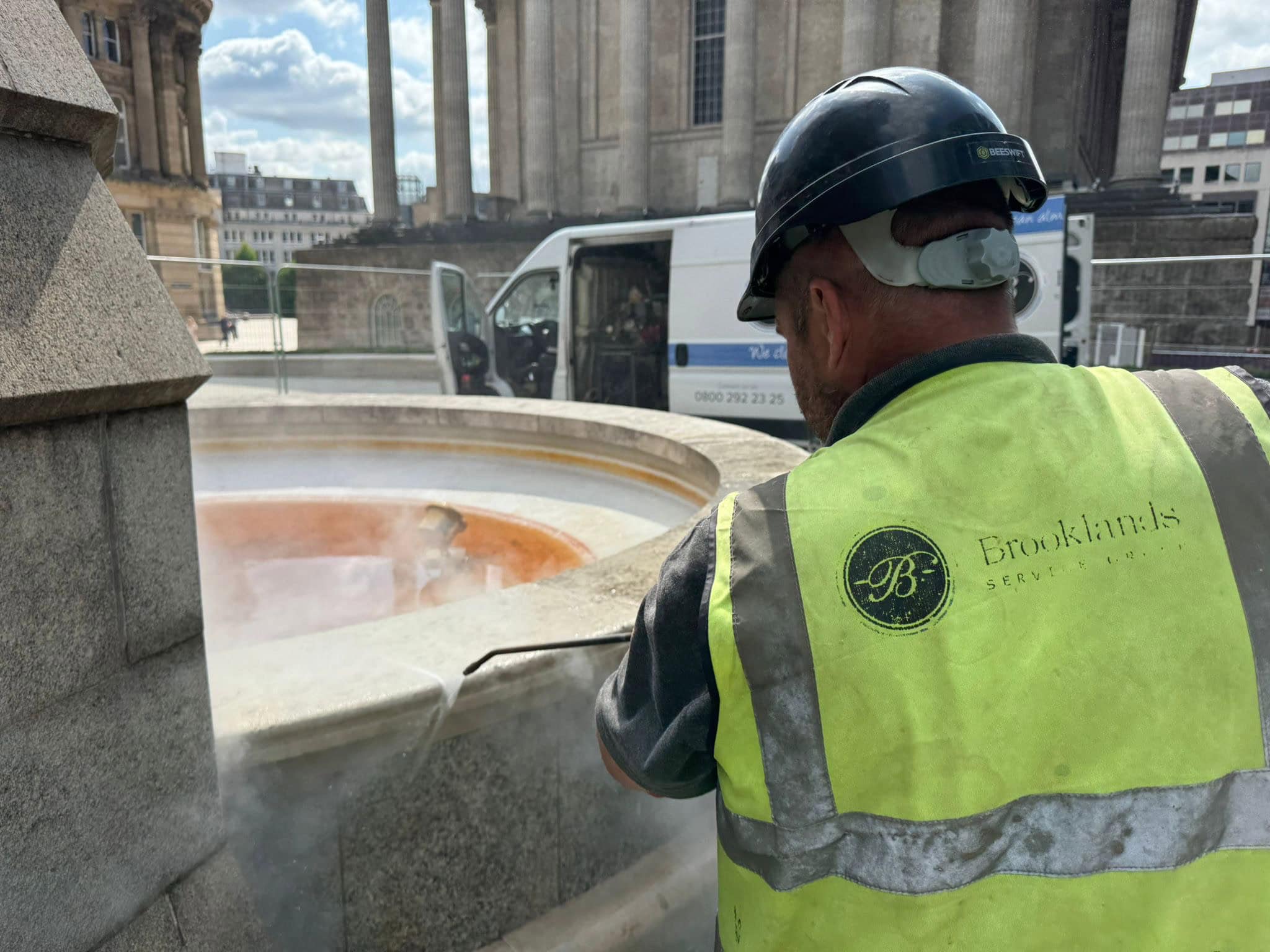 Brooklands Group’s early-morning strategy and specialist cleaning techniques removed the staining from the stone and restored the monument’s visual integrity while preserving its historic fabric. The project was delivered with: