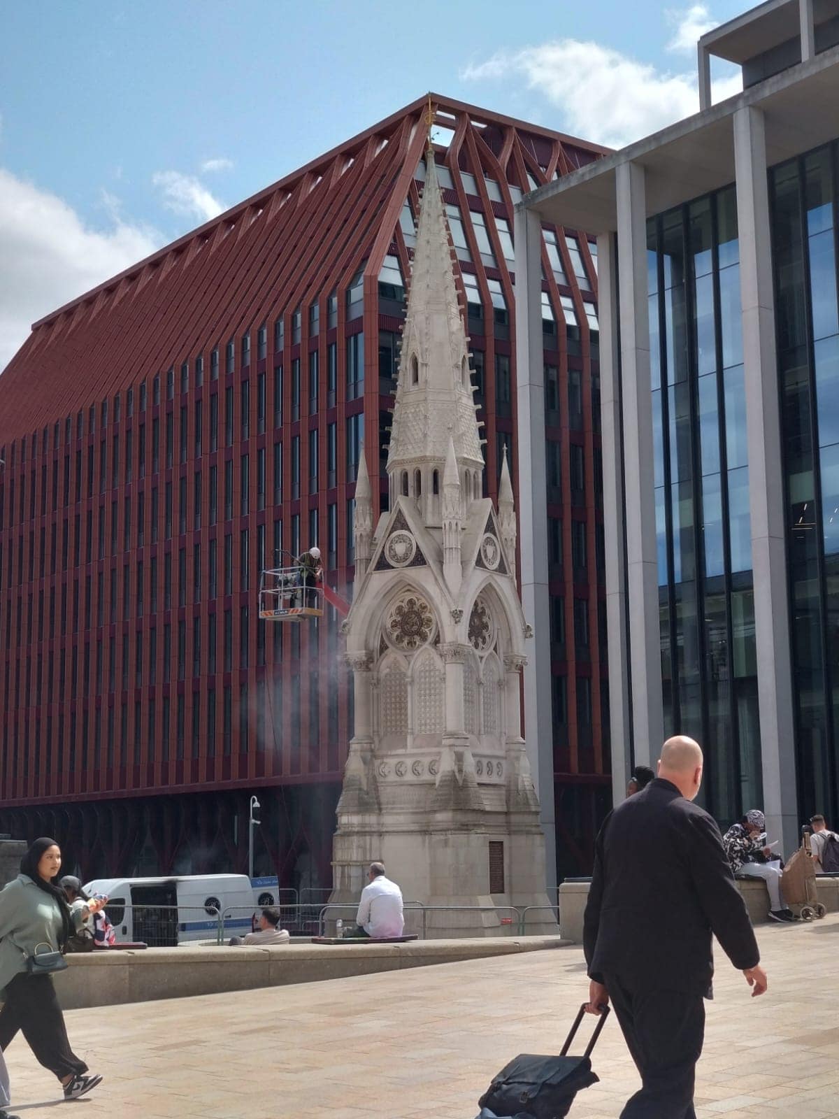The statue’s central location posed significant logistical hurdles to ensure the specialist cleaning team and public were safe. Chamberlain Square is a high-footfall zone, surrounded by offices, restaurants, and cultural landmarks. Deploying Mobile Elevating Work Platforms (MEWPs) in such a setting required: